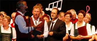 Der zweite Teil war dem Auftritt der Chor Gemeinschaft Lachen im Allgäu vor behalten. Mit dem Verein in der ca. 1500 Einwohner zählenden Gemeinde im Ostallgäu ver-bindet die Sänger aus Buggingen eine langjährige Freundschaft, wie Günther Schlenker als Vorsitzender des Gastgebervereines betonte. Das Repertoire umfasste vorwiegend moderne Liede3r. Jedoch standesgemäß nach bayrischer Lebensart überreichte der dortige Vorsitzende an den Gastgeber ein Fass des Gerstensaftes und an Gün-ther Schlenker und Mathias Untch symbolisch einen Bierkrug.